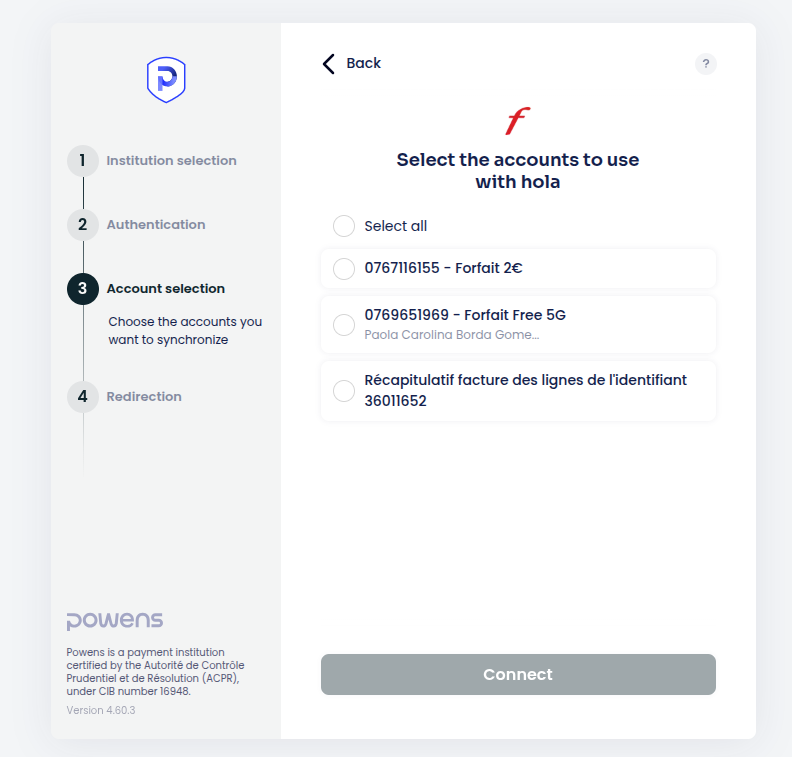 And then, Powens fetches all my documents available in Free. I am prompted to see what info I am interested in. I chose all: