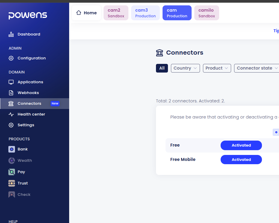 Remember, Powens is in the B2B business. When you log in, you are a “company” integrating Powens: You are configuring Powens so that your clients (or you personally) can use Powens’ services.